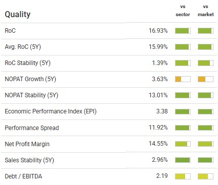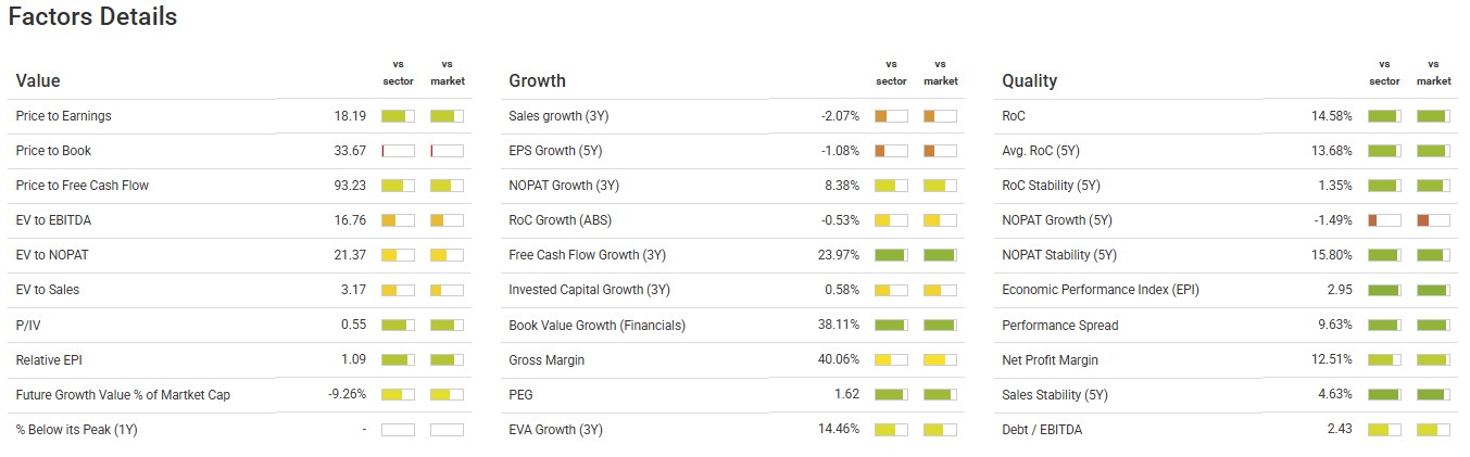 A review of Colgate’s key metrics highlights why the company fits well within our screen for quality companies. In CPMS’s Factors Detail section, Colgate ranks above the 90th percentile for nearly all quality measures, both within its sector and across the broader market. Notably, the company demonstrates a ROC stability (5Y) of 1.39 per cent and an ROC (5Y) of 15.99 per cent, underlining its sustainable earnings and profit generation. Additionally, an Economic Performance Index of 3.38 reflects Colgate’s ability to create economic value, achieving a return on capital that is 3.38x times its cost of capital.