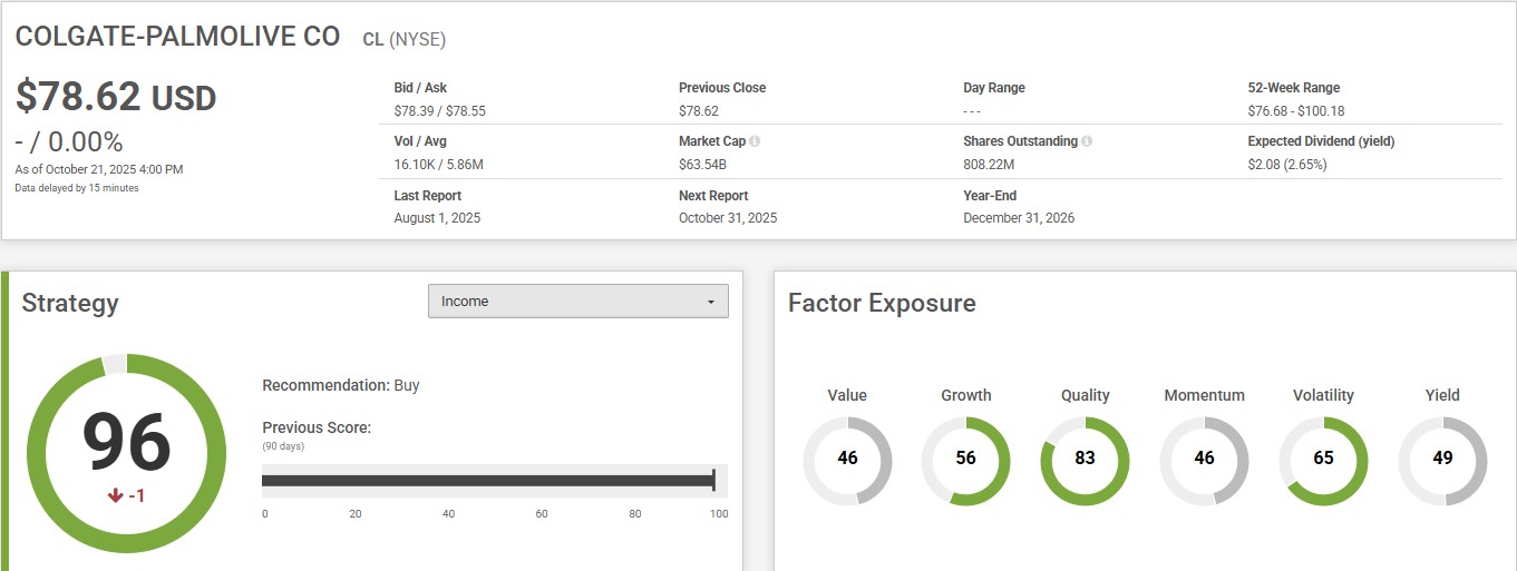 Colgate-Palmolive has a Quality score of 83 and a volatility score of 65, indicating its stability and strong ranking compared to its sector and the overall market. CPMS helps determine the most suitable strategy for a stock, and Colgate’s strong scores in Quality and strength in dividend stability make it an ideal fit for the Income strategy.