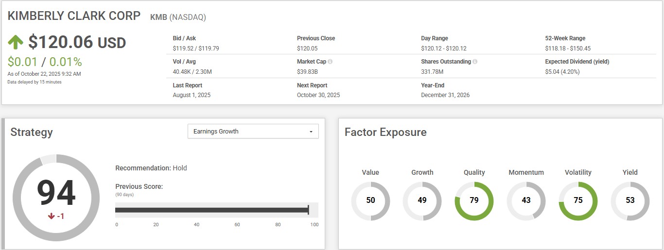 KMB stands out in quality, with a score of 79 in that category. Furthermore, it has a great score in Earning growth strategy. The CPMS US Earnings Growth Strategy is suited for investors seeking high growth rates. It is designed to select stocks with strong reported returns on equity. The strategy emphasizes stocks with high current profitability to equity ratios. Importance is also placed on stocks with high earnings estimate revisions and earnings surprise.