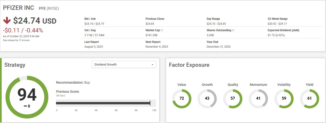 Pfizer has a value score of 72 and a yield score of 61. The company has an impressive dividend yield of 6.9%. Additionally, it scores 94 in the Dividend Growth strategy. CPMS US Dividend Growers Strategy is suited for income-oriented investors seeking to invest in financially stable companies that are consistently growing their dividends. Stocks must have increased their dividend for at least five consecutive years.