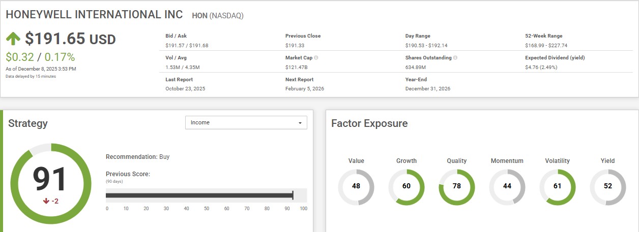 Honeywell International has a Quality score of 78 and a volatility score of 61, indicating its stability and strong ranking compared to its sector and the overall market. CPMS helps determine the most suitable strategy for a stock, and Honeywell’s strong scores in Quality and strength in dividend stability make it an ideal fit for the Income strategy.