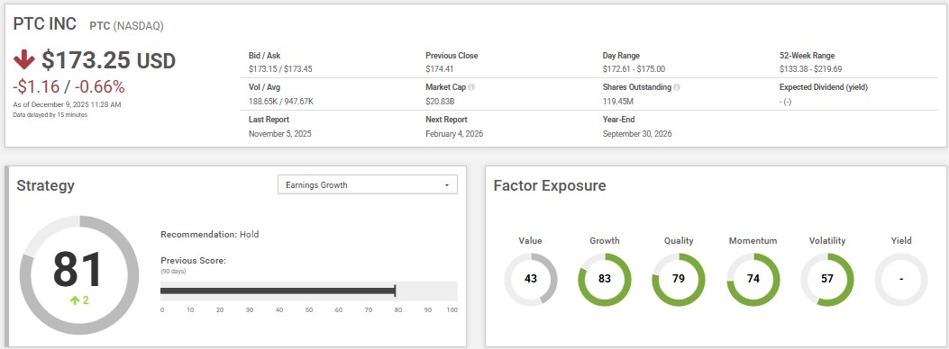 PTC Inc. has a growth score of 83 and a quality score of 79. Additionally, it scores 81 in the Earnings Growth strategy. The CPMS US Earnings Growth Strategy is suited for investors seeking high growth rates. It is designed to select stocks with strong reported returns on equity. The strategy emphasizes stocks with high current profitability to equity ratios. Importance is also placed on stocks with high earnings estimate revisions and earnings surprise. PTC’s high growth and quality metrics makes it to be suitable for the strategy.