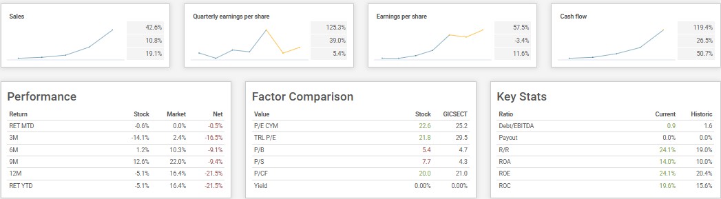 CPMS’s provides a compelling view of the company’s growing sales, cashflow and earnings. Diving into individual metrics, we see that PTC has a quarterly sales growth of 42.6 per cent and the company’s quarterly and annual cashflow momentum to be 26.5 and 50.7 per cent respectively. Analyzing PTC’s comparison with its own sector shows it has been trading at a better price-to-earning and price-to-cashflow.