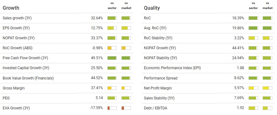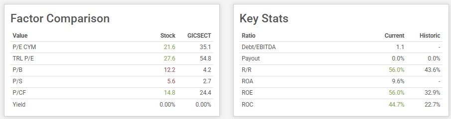 The factor comparison section showcases the company’s better metric when it comes to valuations compared to its sector. The lower P/E and P/CF compared to its sector makes it undervalued and attractive due to its efficient cash generation compared to its sector.