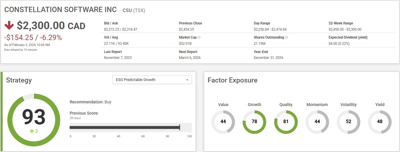 Constellation Software stands out in Quality and Growth, with a score of 81 and 78 in those categories. Therefore, it has a great score in CPMS’s ESG Predictable Growth. The Predictable Growth strategy is designed for sustainability-conscious, conservative investors seeking growth at a reasonable price. The strategy looks for ESG risk-screened stocks with good earnings value, whose book values are growing but whose earnings have low levels of variability. It also looks at earnings surprise and quarterly earnings momentum.