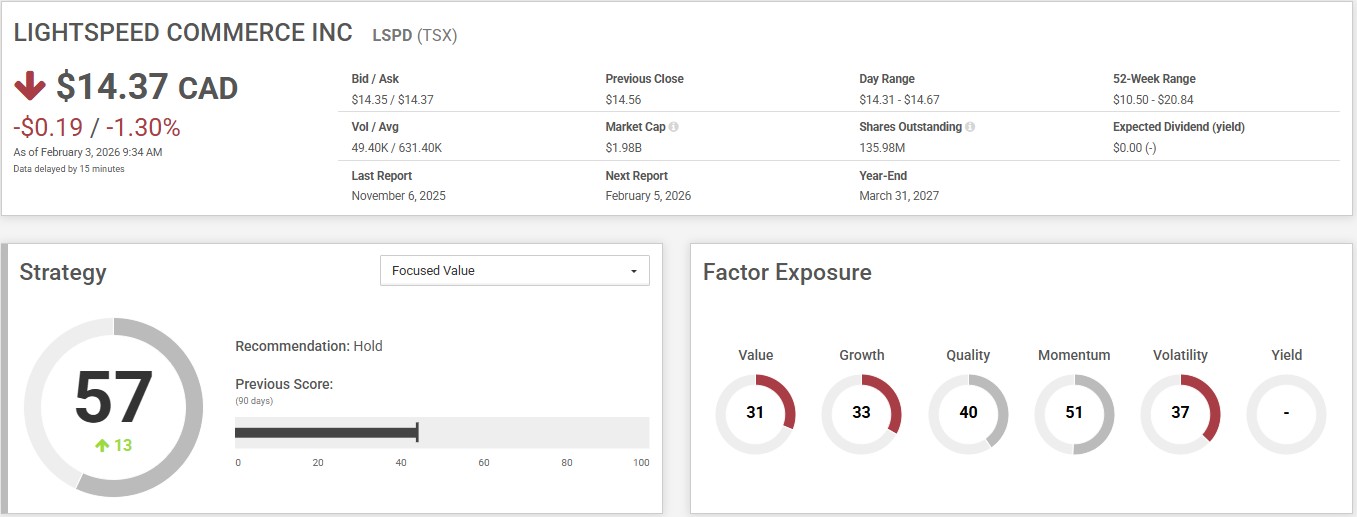 Lightspeed has a Momentum score of 51, indicating its momentum ability ranking compared to its sector and the overall market. CPMS helps determine the most suitable strategy for a stock, and Lightspeed’s saw strong improvement in the Focused Value strategy. The CPMS Focused Value Strategy is designed for investors seeking undervalued yet highly potential and financially stable stocks which are eventually rewarded by the market. The strategy starts with CPMS Canadian universe focusing on core value parameters like Price to Earnings, Price to Sales, Price to Cashflow and Price to Book Value to identify undervalued stocks. Importance is also placed on stocks with high Earnings Estimate Revisions.