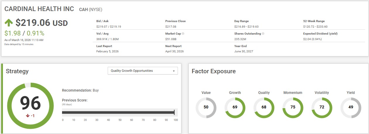 Starting with Cardinal Health, we can see that the company scores very strongly under CPMS’s Quality Growth Opportunities strategy, with an overall strategy score of 96. The Quality Growth Opportunities strategy is designed for investors looking for stocks with credible growth potential supported by steady earnings momentum. The strategy identifies stocks with high reinvestment rate and earnings momentum in recent years.