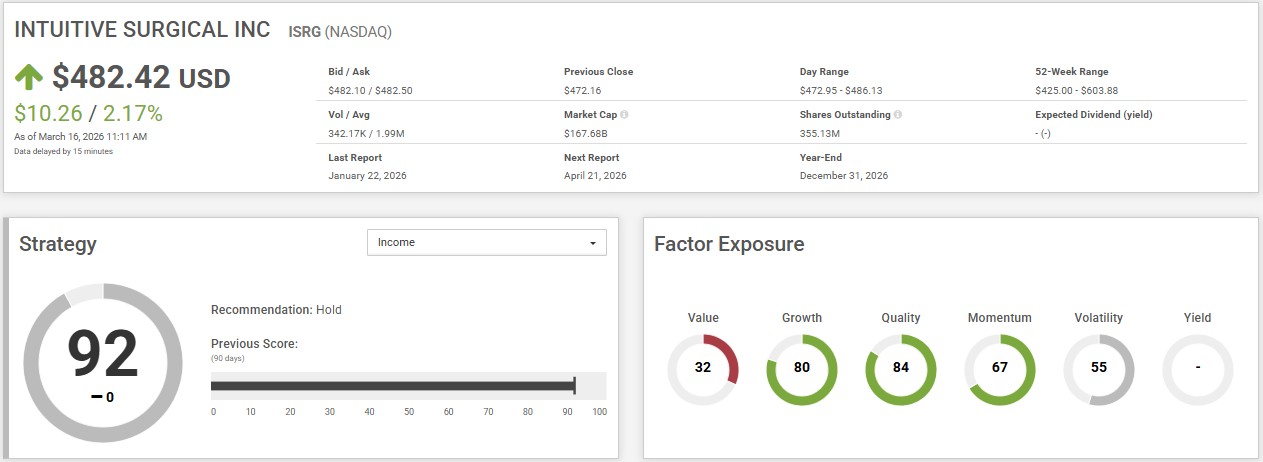 Looking at its factor exposures, the company shows notable strength in Quality (84) and Growth (80). The broader factor profile suggests that Intuitive Surgical remains a high-quality growth company with strong operating characteristics and continued market support.