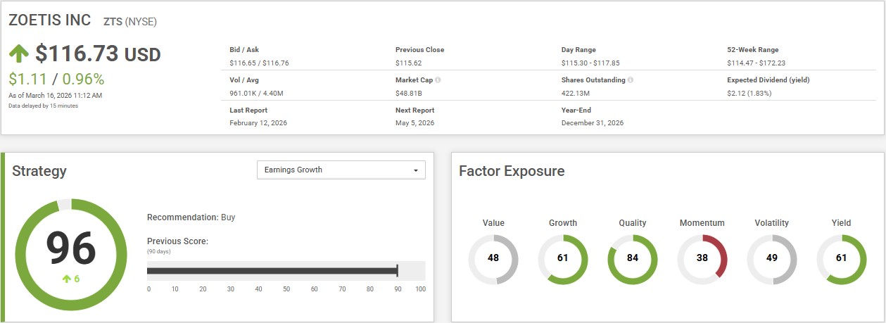 Turning to Zoetis, the company stands out with a strategy score of 96 under the Earnings Growth strategy. The CPMS US Earnings Growth Strategy is suited for investors seeking high growth rates. The strategy emphasizes stocks with high current profitability to equity ratios. Importance is also placed on stocks with high earnings estimate revisions and earnings surprise.